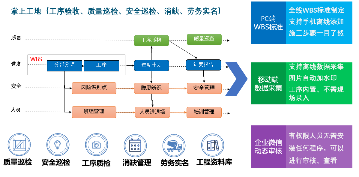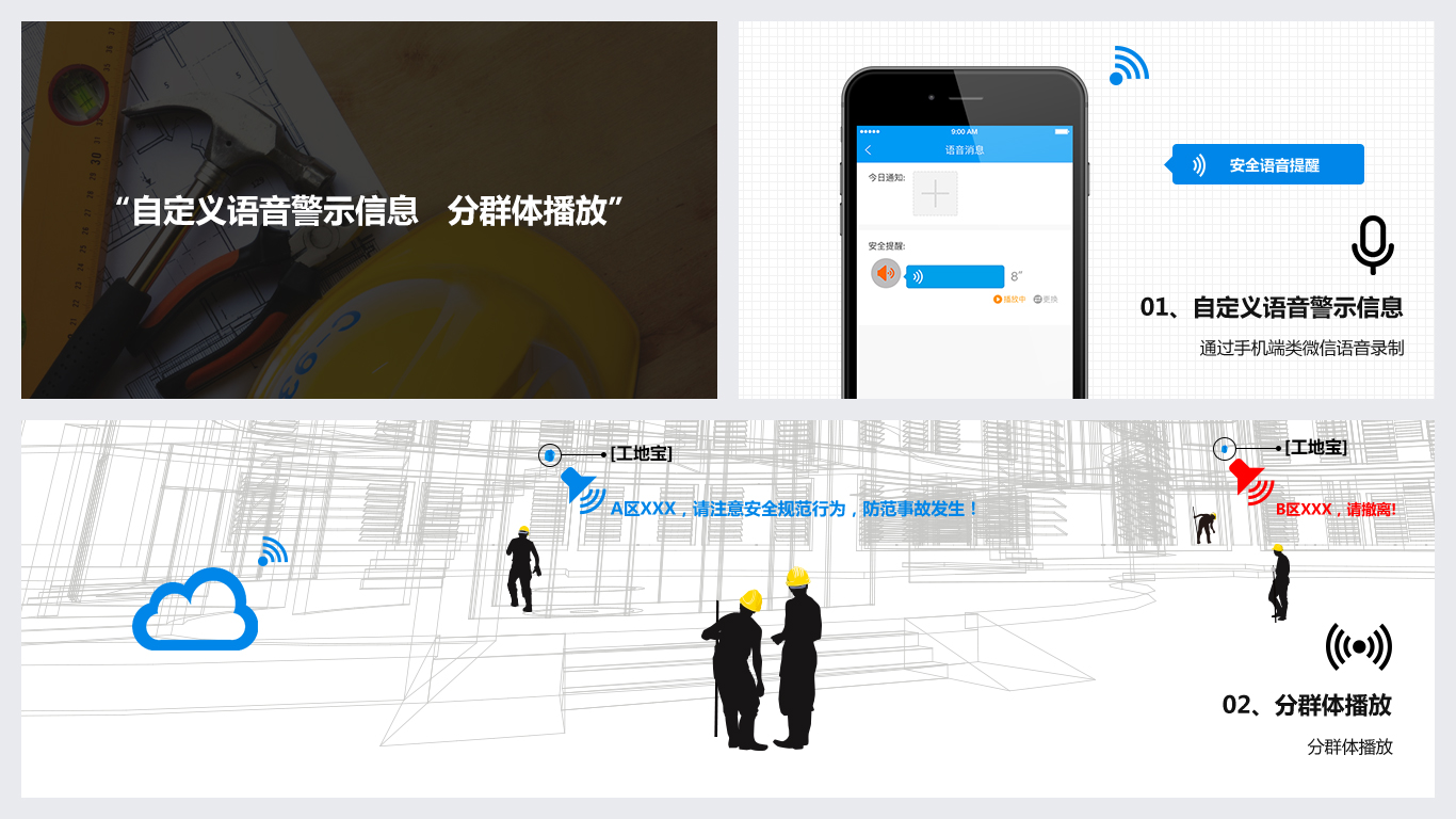 当施工人员进入施工现场,通过考勤点设置,主动感应安全帽芯片发出的信号,区分队伍和个人,进行预警信息播报;预警信息预置可通过使用手机端自助录入。