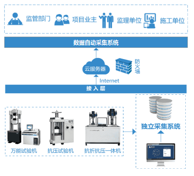 利用互联网和物联网技术对试验检测过程中的压力机、万能试验机等重要试验仪器的试验数据进行自动采集、实时上传、分析统计、提醒等。系统及时准确地获取现场试验室混凝土强度、钢筋强度等检测数据,分析处理数据发现工程建设中存在的问题,并采取相应的措施,加强混凝土质量和工程质量控制。针对不合格的数据以手机短信方式自动报警,可进行历史数据的查询、综合分析和汇总。