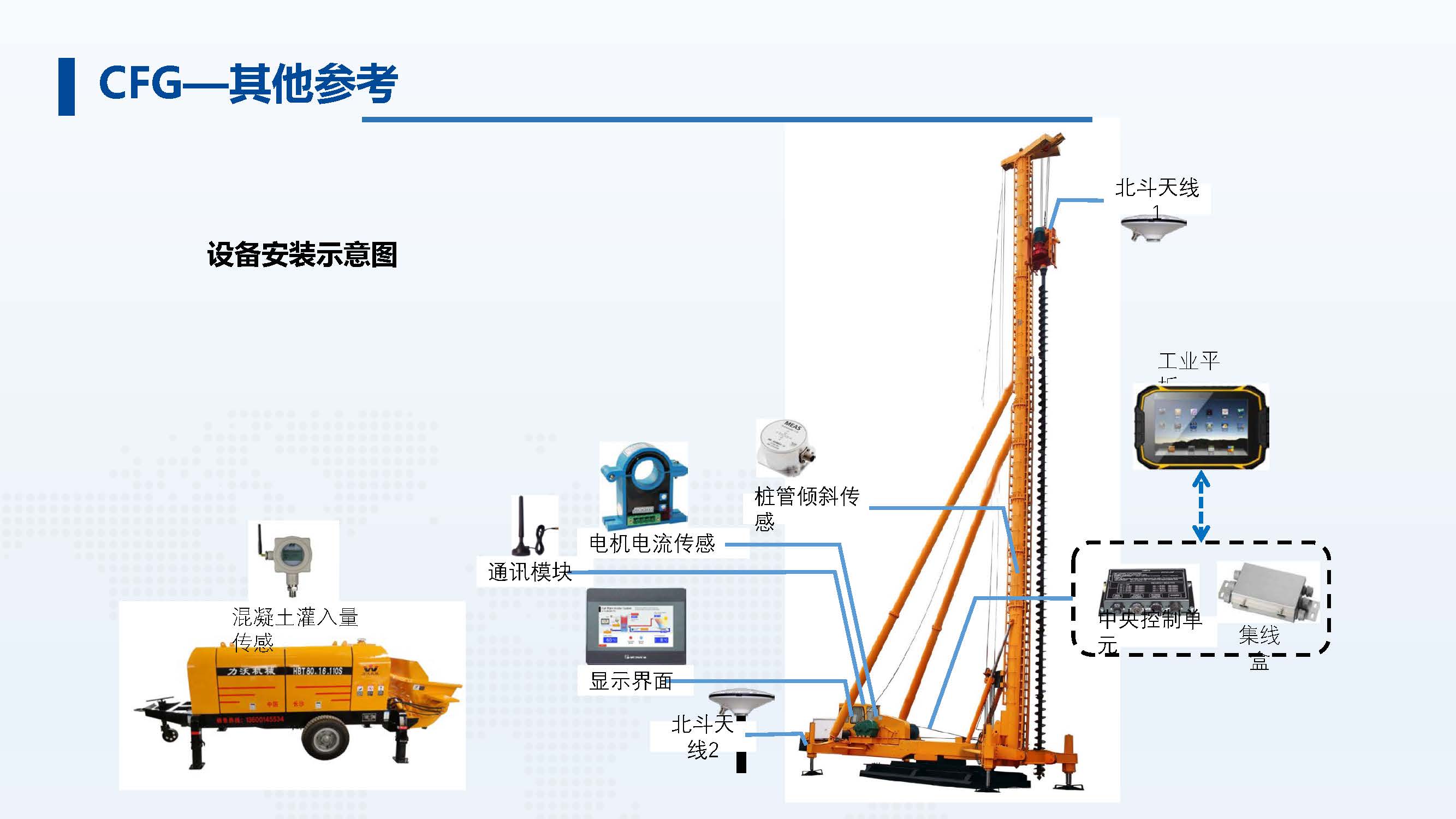 北斗定位模块:通过两个天线的精准定位可以判断 CFG 桩机方位,方向,CFG 桩机桩杆位置以及桩机所在地表高程。